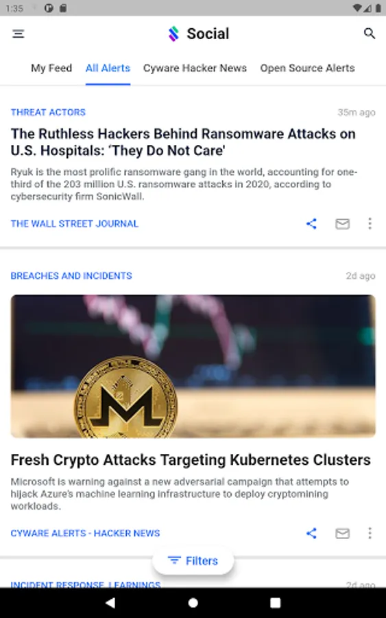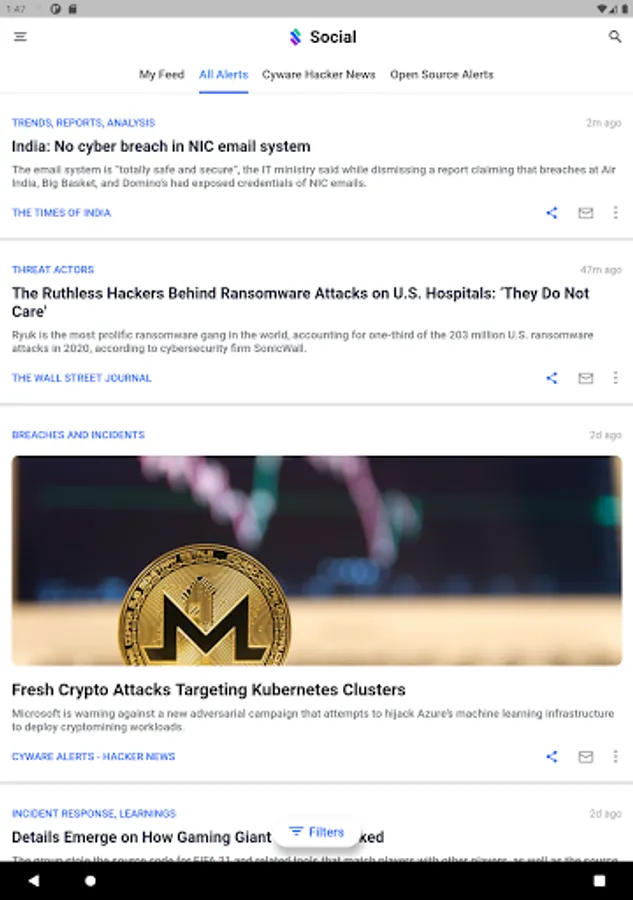 EASY ACCESSIBILITY: Quickly switch between alert categories from quickly accessible segments on the header and easily scroll through updates from Cyware Hacker News and Open Source Alerts.