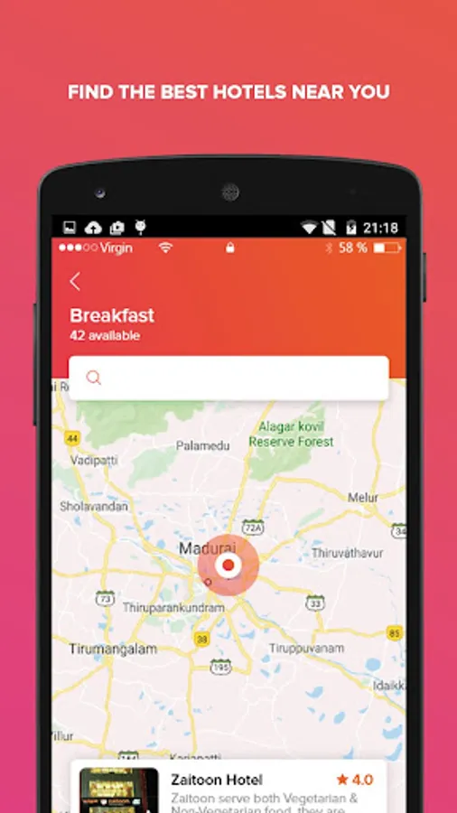 The best thing is that you can search the best hotels/street-foods available near-by you with “Kilometers” search option.