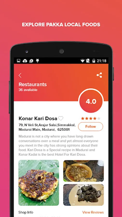 Madurai Food Guide is your encyclopedia of the best hangout spots and food joints in area near-by you. Whether you want to attend a barbecue with your family or order-in or hang out in a club or relish a cup of coffee with your friends, Yo Madurai Food Guide app helps you discover the best places with different varieties of food.