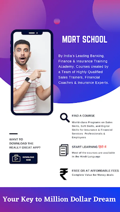 "Mdrt School is an ed-tech app designed to provide high-quality sales and skill development training to banking, financial & and insurance professionals. The app offers a wide range of courses, training programs, and study materials, catering to various professional disciplines like Financial Advisors, Wealth Advisors, Relationship Managers, Sales Employees, Sales Leadership, etc