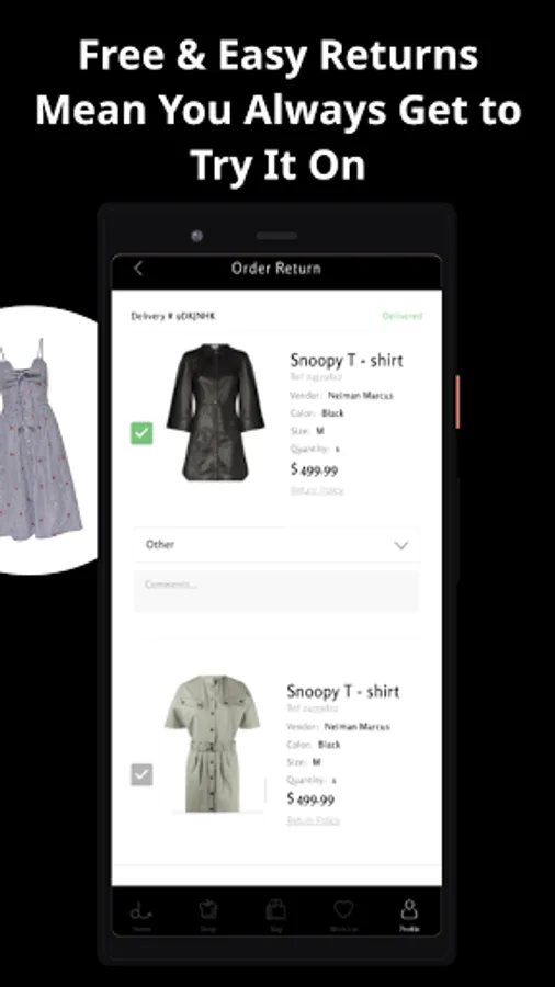 dressit focuses on trendy and high end fashion, showcasing only the best in clothing design. Find the latest styles from your favorite brand name or clothes designer so you’re always wearing pieces that are in vogue. Use dressit as a reliable source of inspiration for a stylish outfit that will help you achieve the hottest runway look from the newest fashion design trends. Unsure of how a color looks or how it's going to fit on you? No worries we take care of this. Just order, and you can easily return the undesired items the next day with our free returns pick-up service! And the best part is…You don't pay!