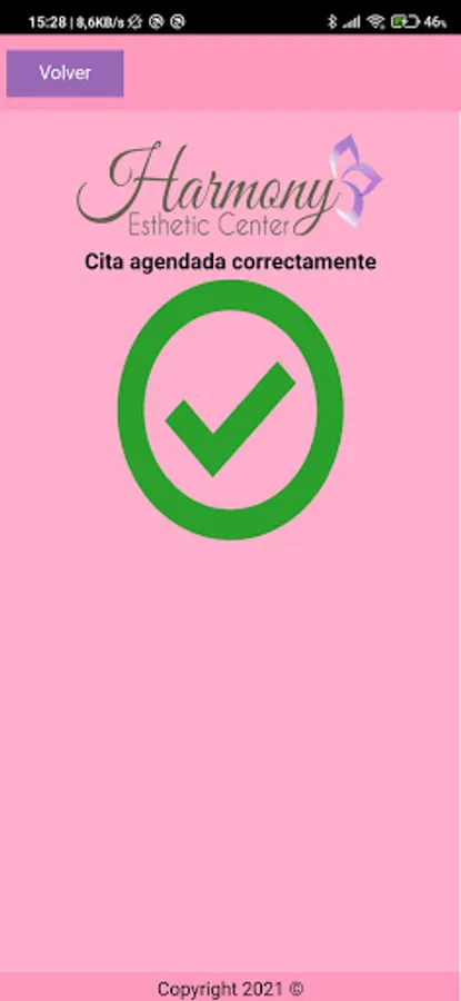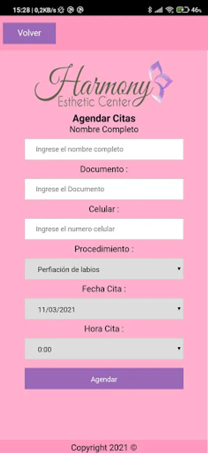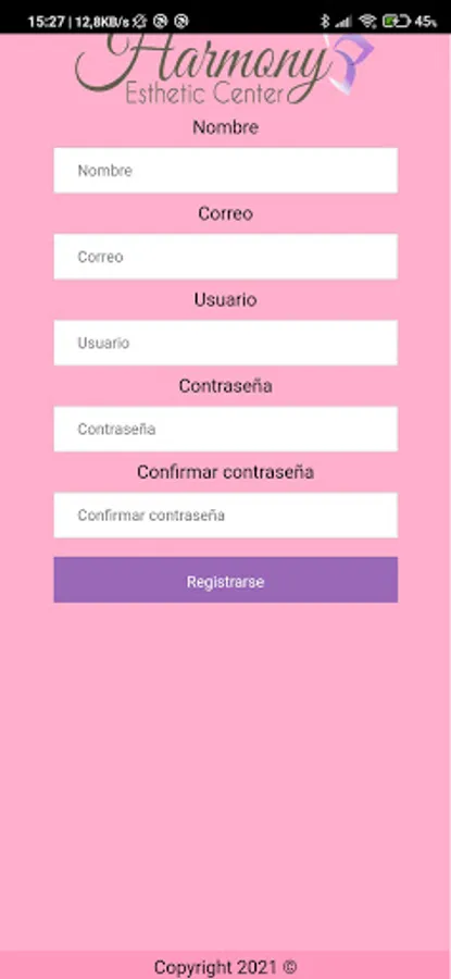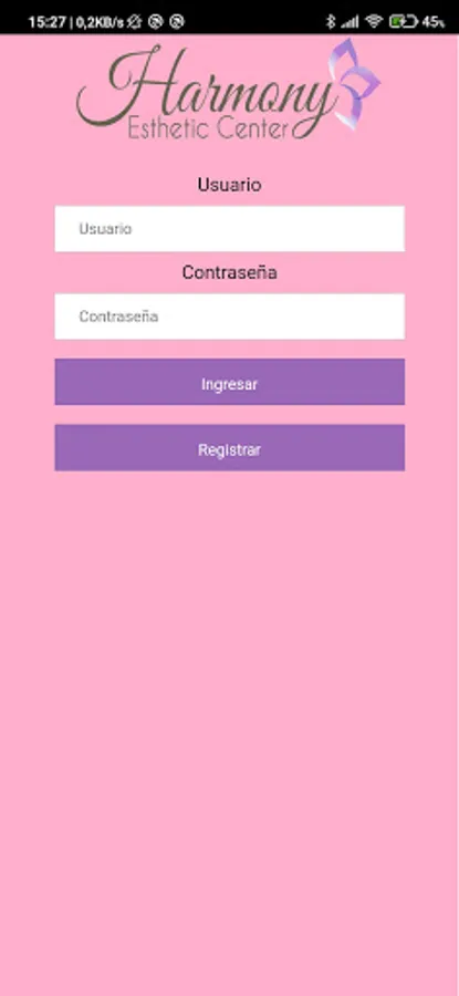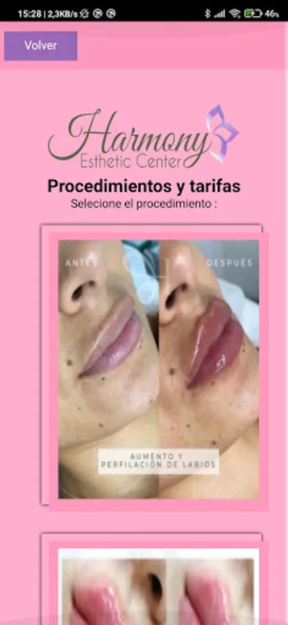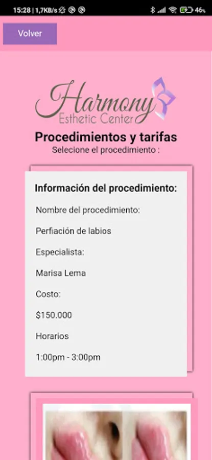 University practice application, which allows you to schedule appointments and see procedures of an aesthetic center called Harmony.