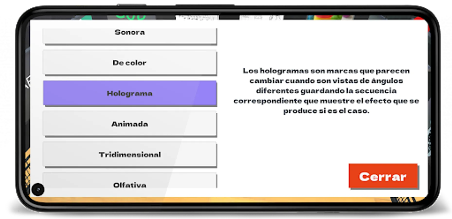 Mobile application to learn about the registration of trademarks in the framework of the Colombian intellectual property system. In this application you will learn about the different types of trademarks that exist, as well as the conditions for registering a trademark. The application has two modes of operation: Learning and Assessment. Additionally, you will be able to see how your performance has been compared to that of other people who are using the application through the leaderboard.