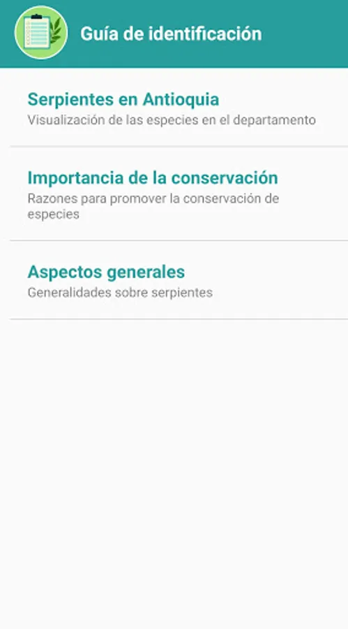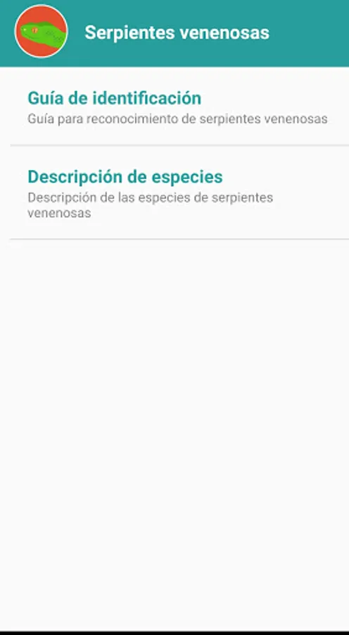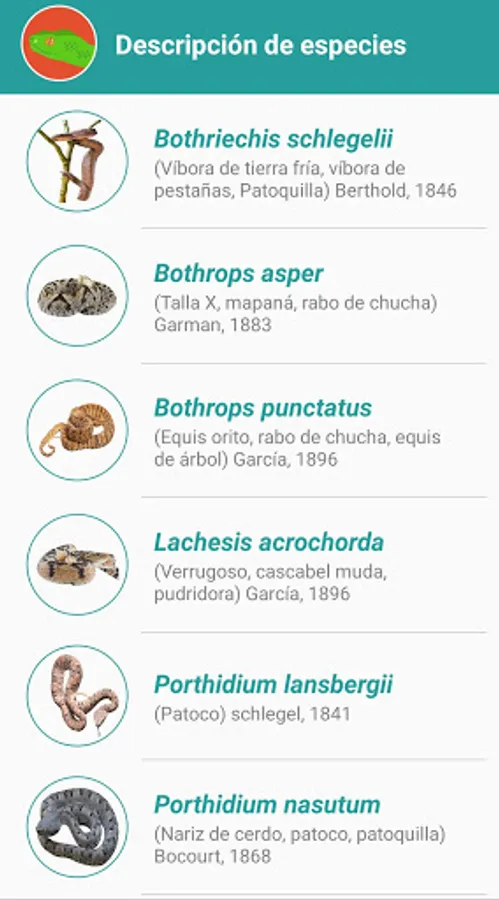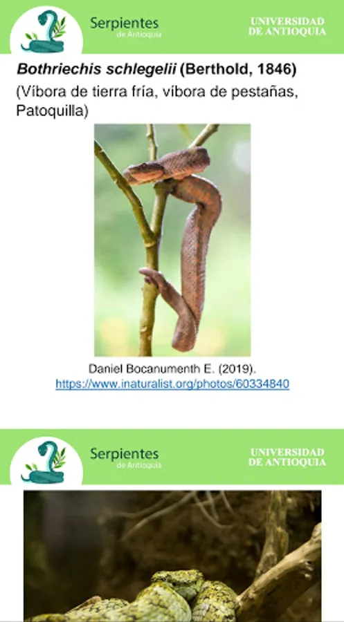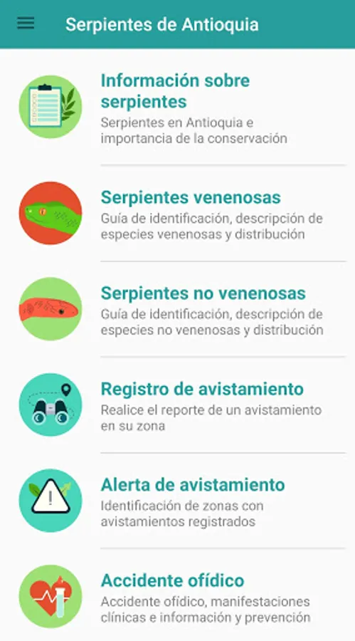 Serpientes de Antioquia - App, is an application developed by the group of Toxinology, therapeutic and food alternatives of the University of Antioquia, as a result of the call "ConTIC Investigo". This application is intended to be a source of reliable and updated information about the snake species present in the department of Antioquia. The application allows the visualization of the most representative snake species of the department, as well as information on conservation, identification, accident prevention and general aspects about snakes.