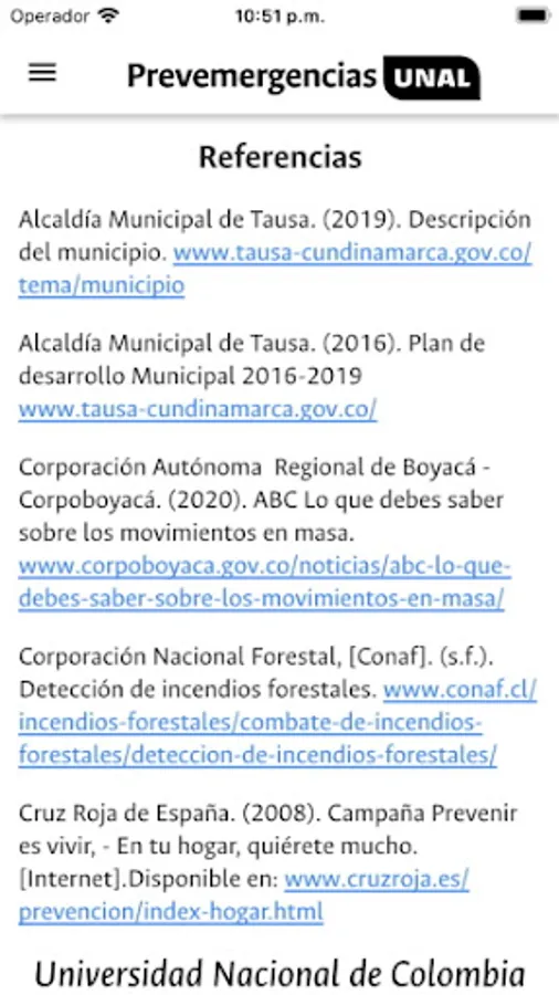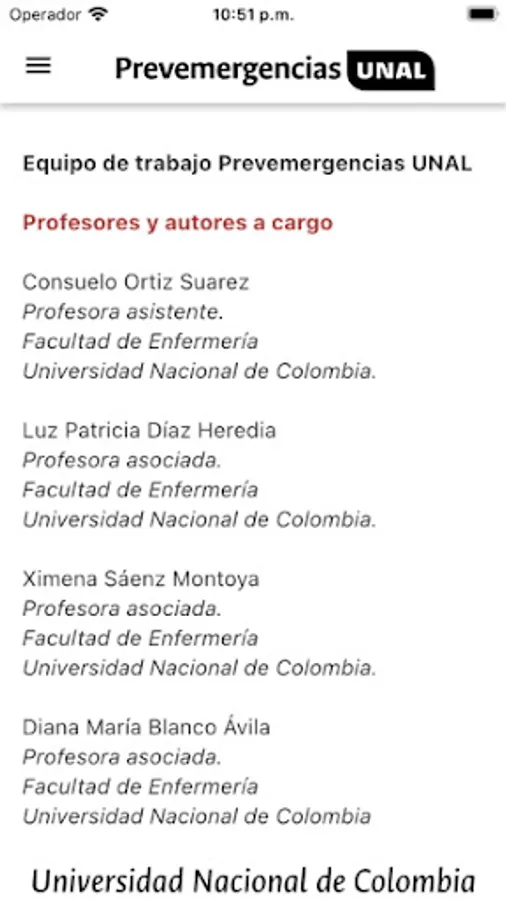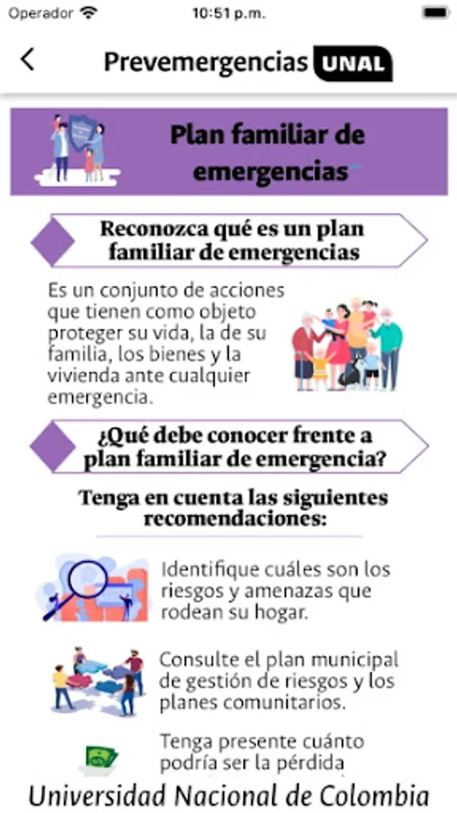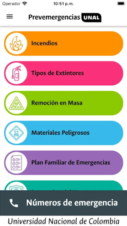 Prevemergencias-UNAL is a mobile application (app) designed by an interdisciplinary team made up of professors from the Faculty of Nursing of the National University (UNAL) of Colombia from the research groups Cardiorespiratory Health Care and Emergency and Critical Care, students of undergraduates, engineers, designers and professionals in the area of risk and disaster management.
