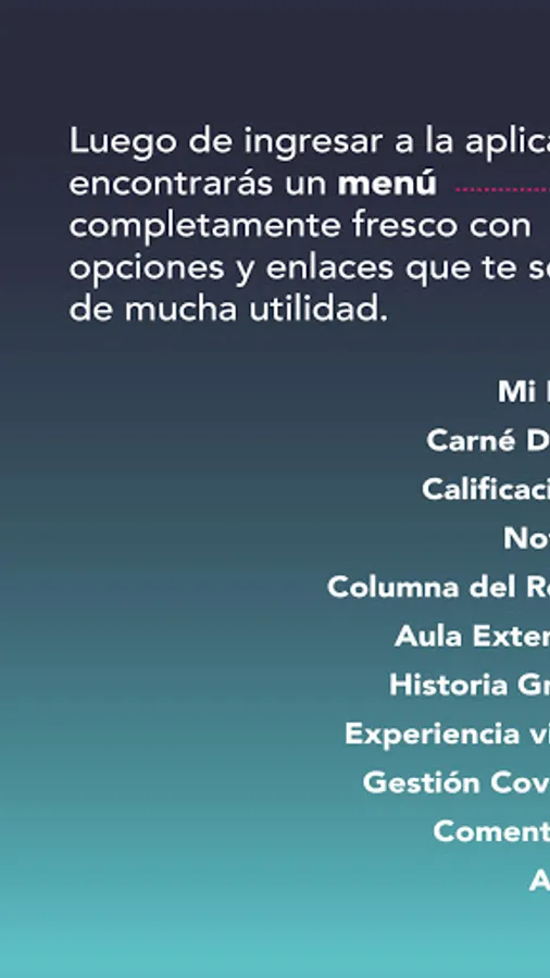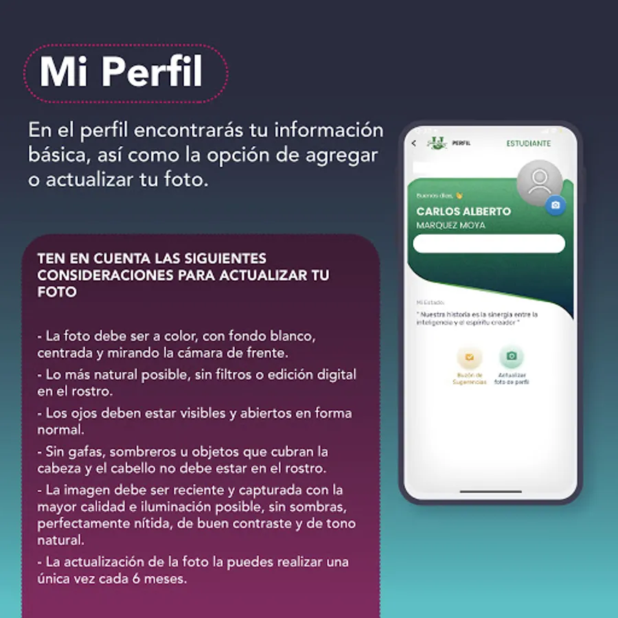 This application will allow the academic community to access the different services that we have enabled in this version, such as: Digital ID, My Profile, Qualifications, Help, ID Photo Update, etc. Among other new options
