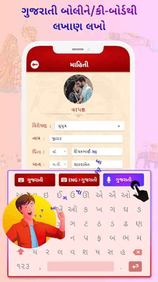 • Enter name of marriage couple ( વર - કન્યા નામ) using gujarati keyboard and gujarati font.