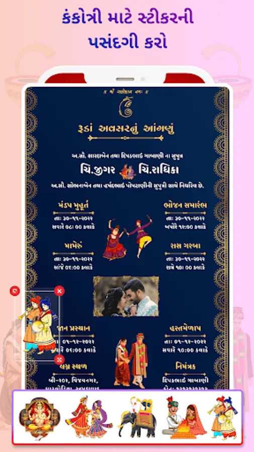 • Add sticker to decorate gujarati marriage invitation card.