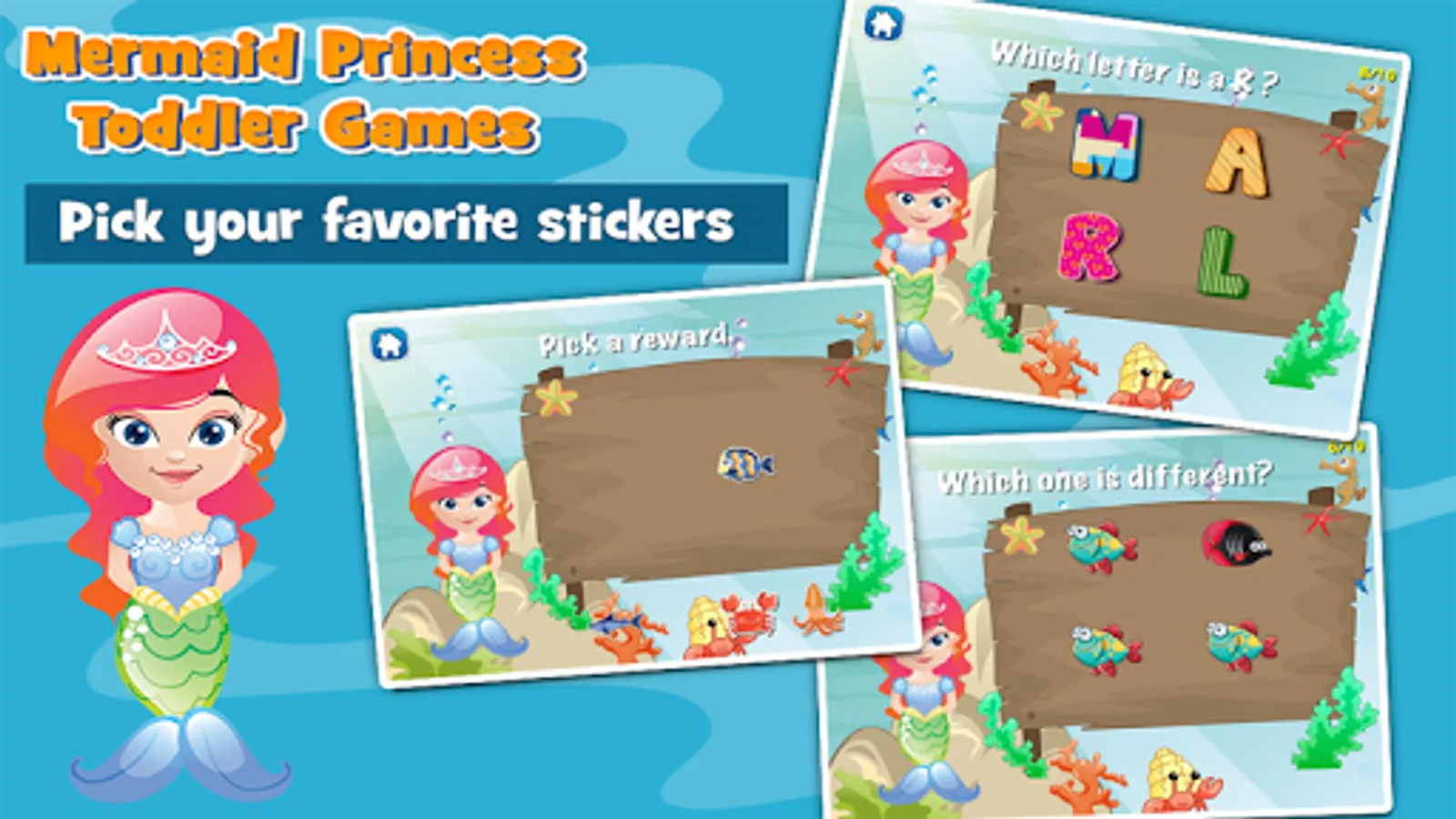 This app teaches your toddler letters of the Alphabet, shapes, colors, numbers, sizes, and spot the different games, all using mermaid and sea graphics and animations.