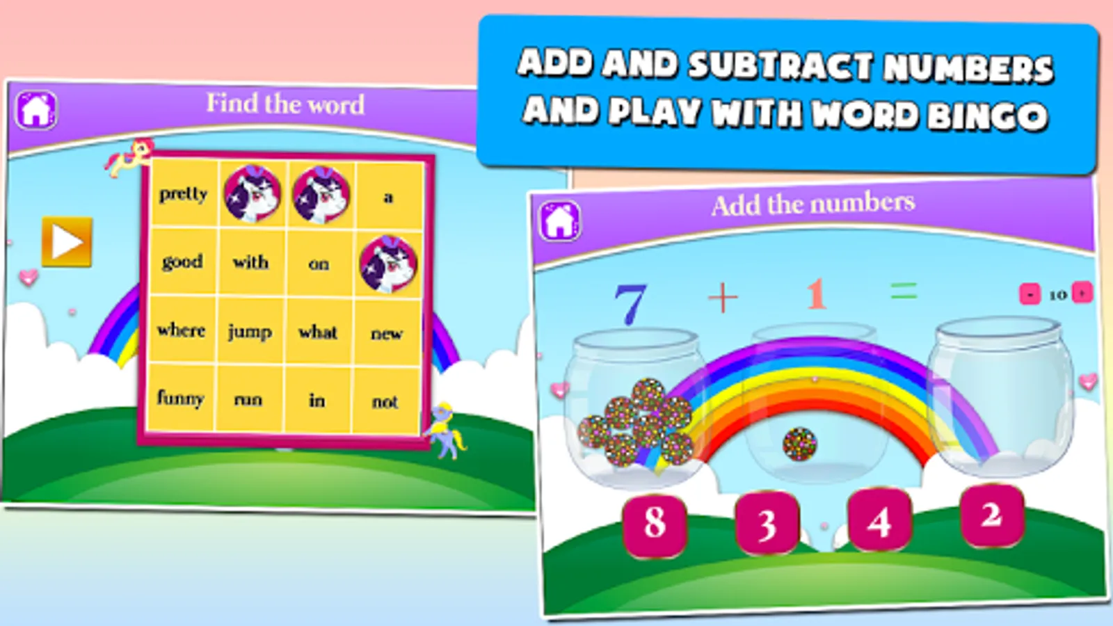 Pony First Grade Learning Games is an interactive educational tool that will grant him an endless ride of fun and yet be at the top of his game! With a pony-themed audio and animation to keep their attention actively captivated, this app lets your pony-trekking learner soaked in layers of fun while absorbing and practicing the key skills for First Grade Math and English.