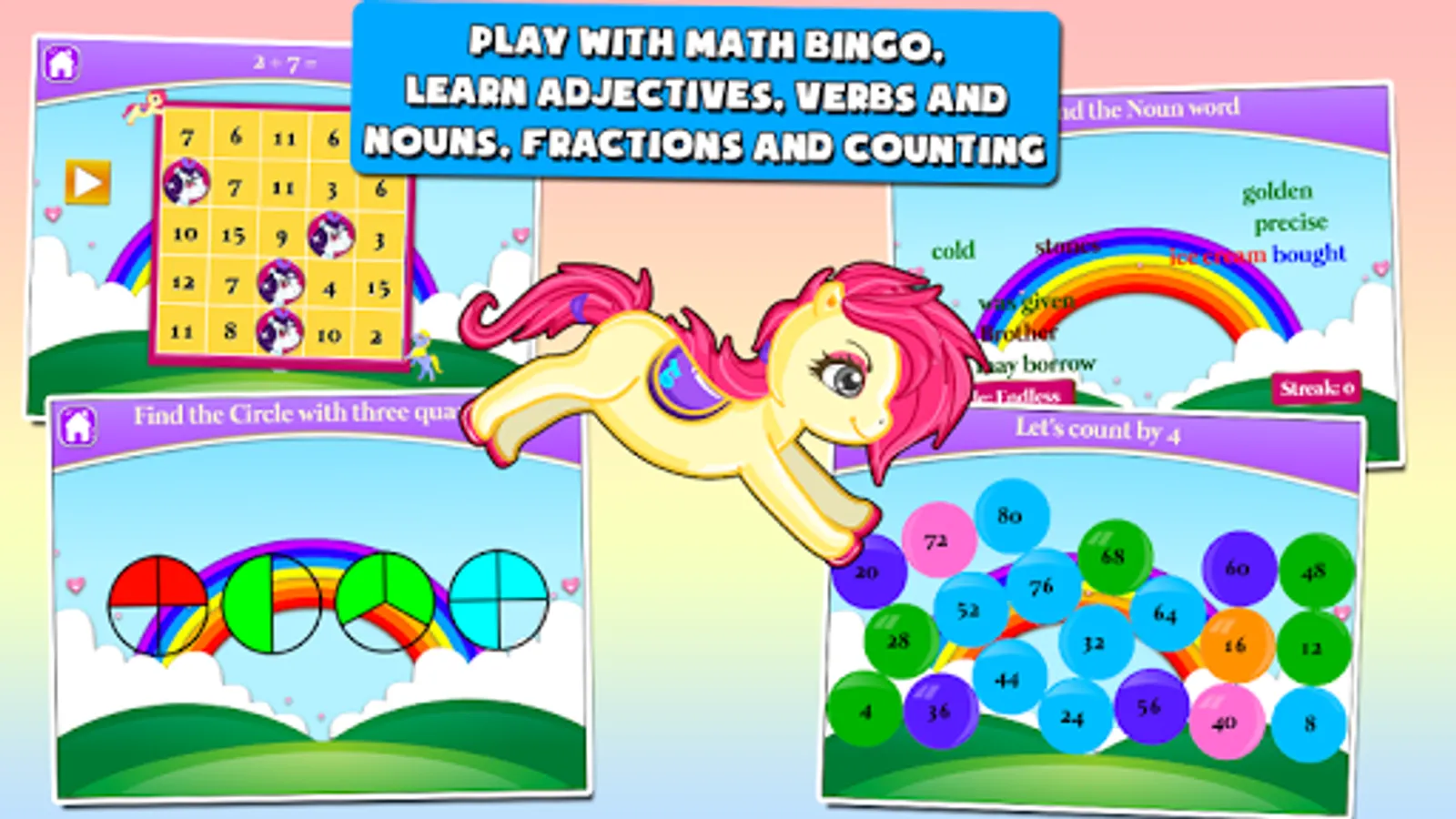 Download Pony First Grade Learning Games now and let your pony-lover youngster have the ride of his life!