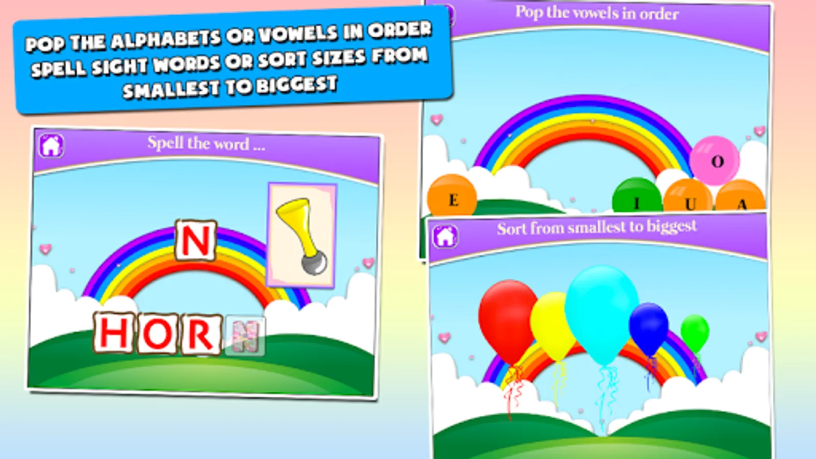 We believe that children learn best in a warm, fun and relaxed environment, hence this app features a variety of activities that will engage every child’s attention and is a surefire means to give your child’s learning skills a boost.