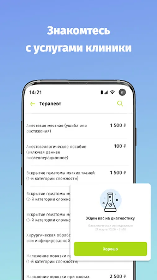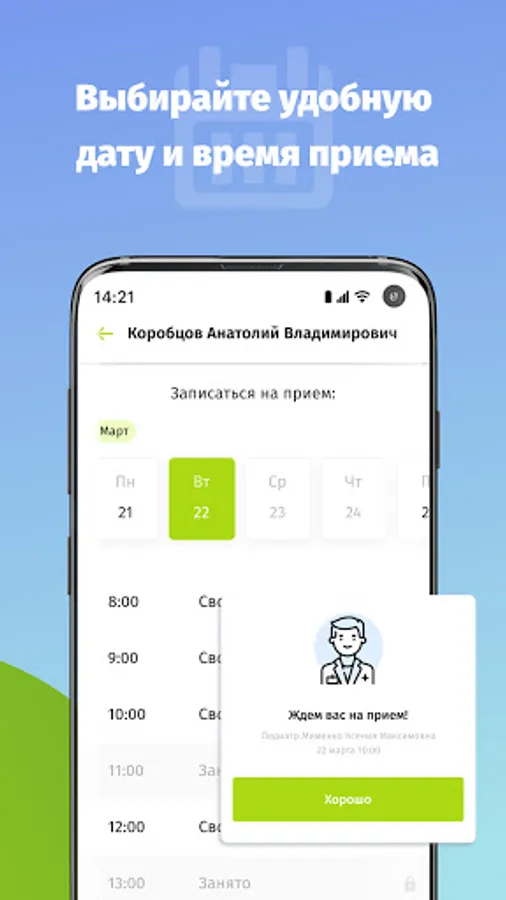 Making an appointment with a specialist or for diagnostics is very simple: select a doctor / direction of diagnostics, date and time of the appointment and click "Sign up".