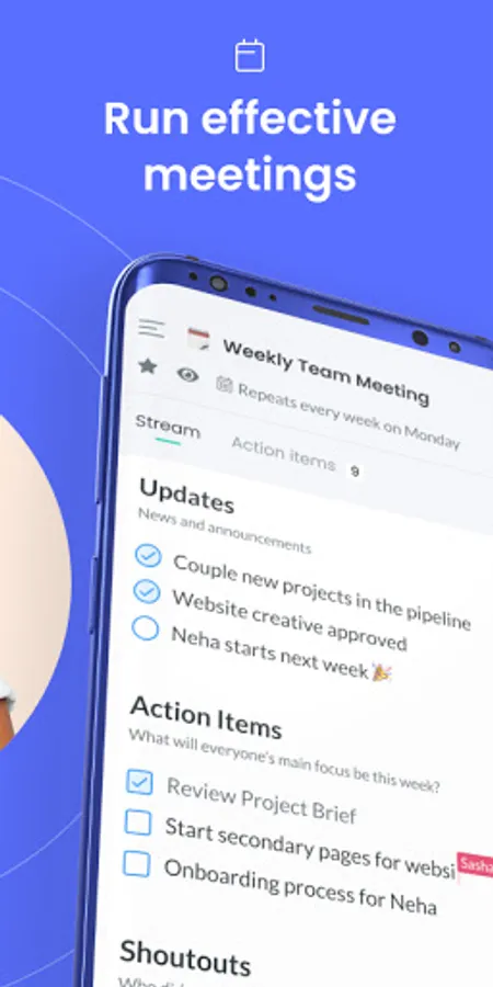 Say hello to meeting productivity. Whether in person or remote, Fellow helps your team build great meeting habits through real-time notetaking, action item tracking, and an expert-approved meeting template library.