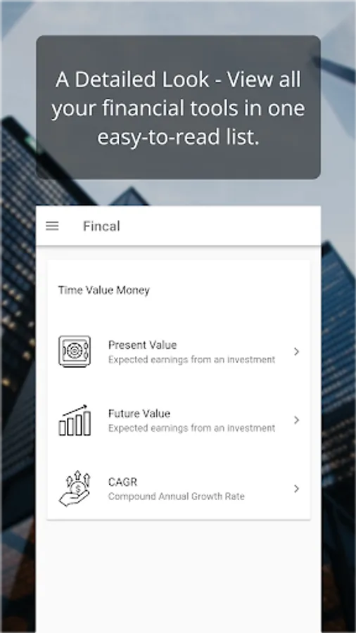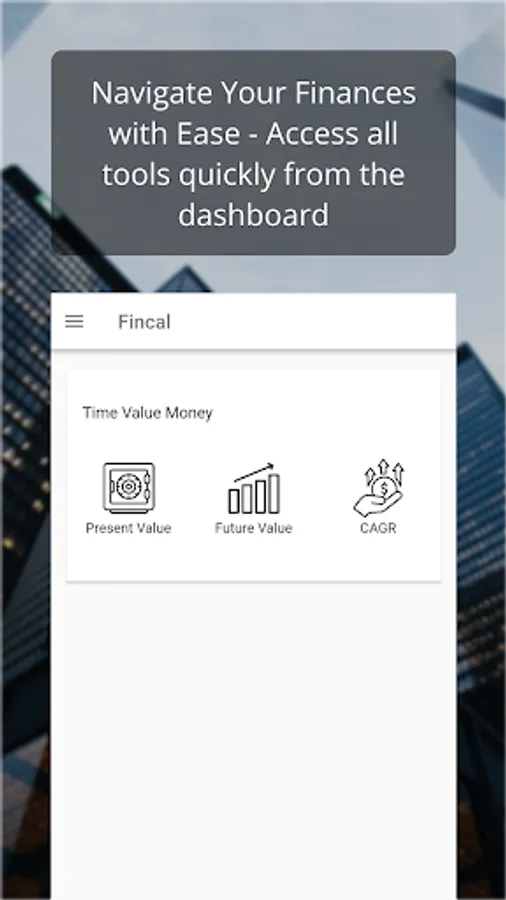 * Comprehensive Calculators: Fincal offers a wide range of financial calculators, including Future Value, Present Value, and CAGR calculators.