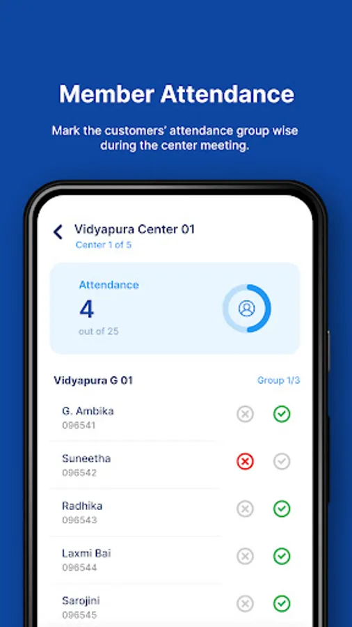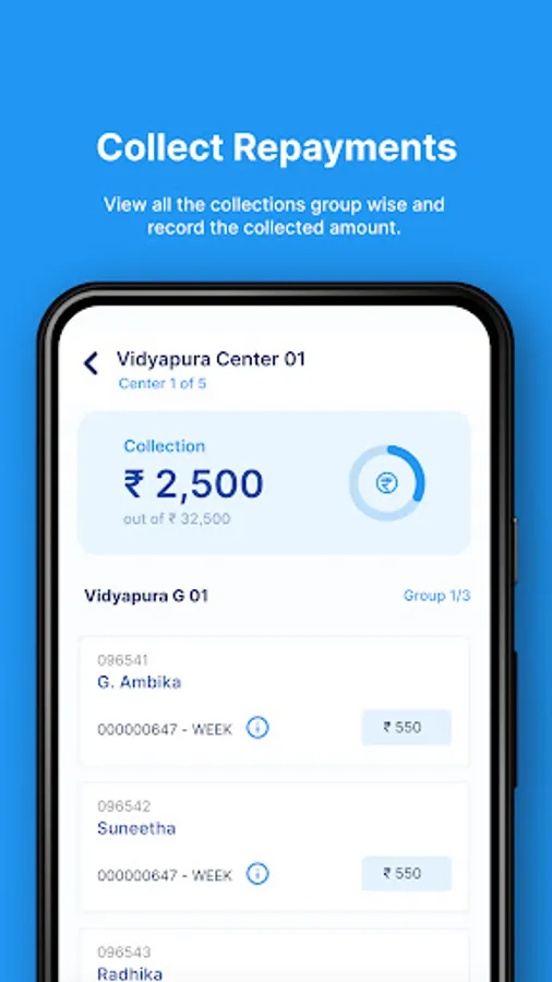 All the repayments to be collected will be shown group wise. The loan officer can record the collected amount for each customer at a time.