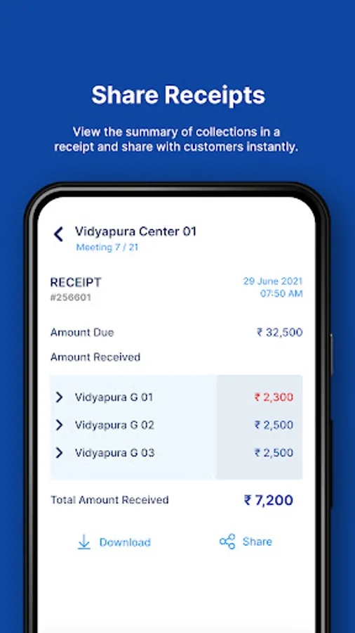 The loan officer can see the receipt of a center after the collections are done. This can be shared in the form of a report to the customers/