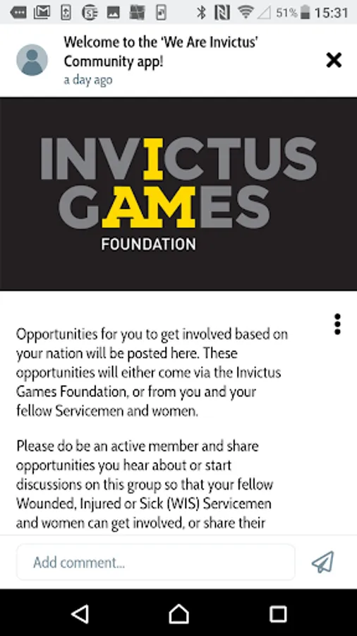 Online Community for international wounded, injured or sick Servicemen and women, serving or veteran. Developed and managed by the Invictus Games Foundation. The Invictus Games Foundation (IGF) Wounded, Injured and Sick (WIS) Community noticeboard and app is for those who have been injured or fallen ill during or as a direct consequence of service. This platform allows WIS to access various opportunities shared by the Foundation in order to support their recovery journey. In addition, this platform also allows for communication between members of the international WIS community to discuss relevant opportunities, share knowledge and support each other during and post-recovery.