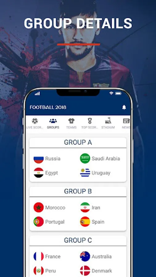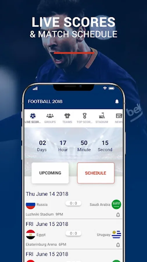 Groups Alarm: user can set alarm for each match News Top scorers Stadiums WC records