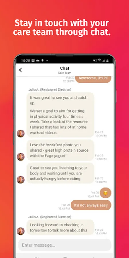 - 1-on-1 advice via text chat: Get support from your registered dietitian -- all on your phone, at the push of a button.