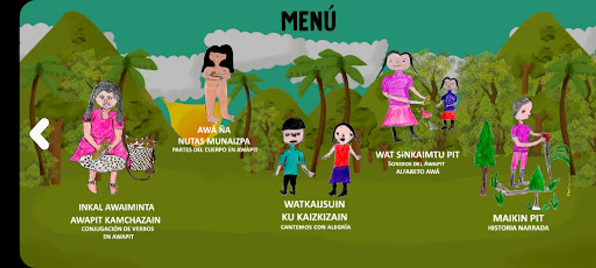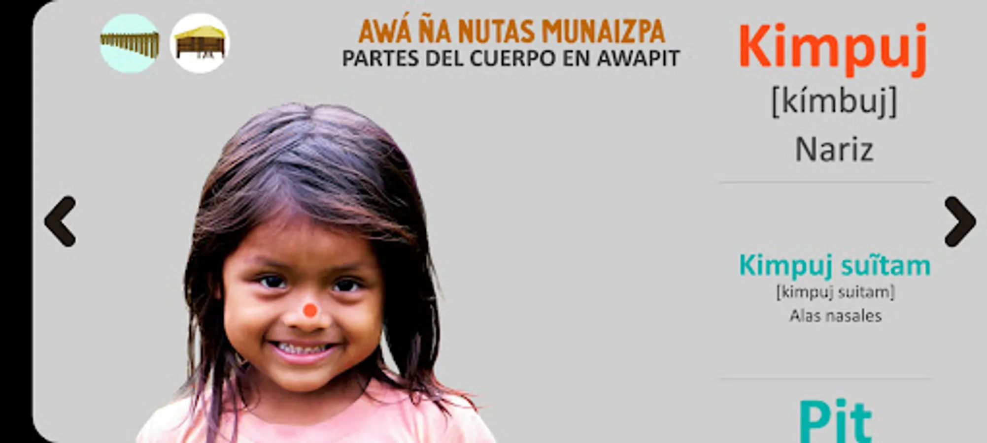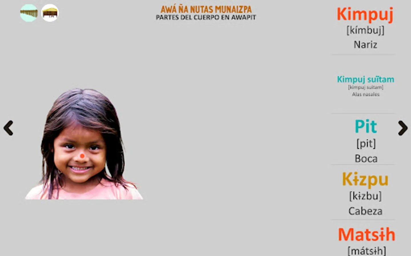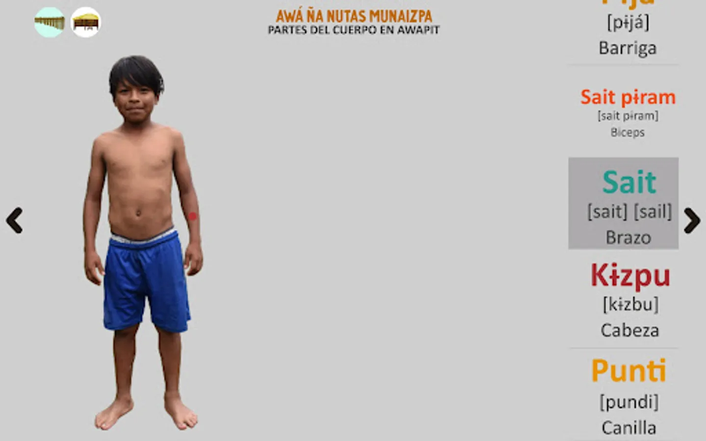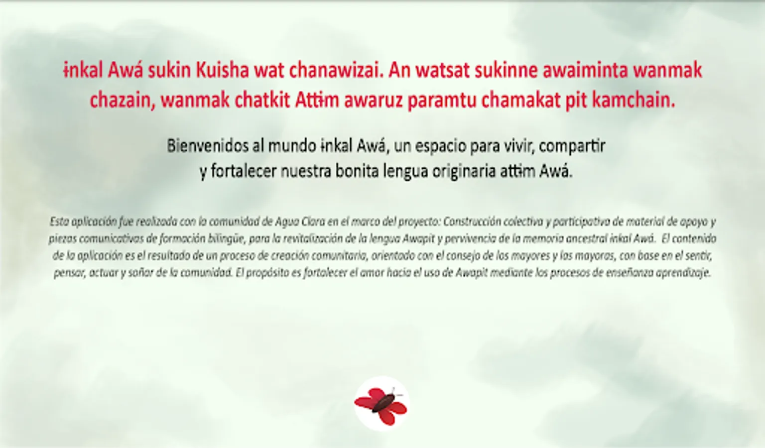 This Application constitutes a pedagogical tool to support the teaching-learning processes of awapit within the framework of the ɨnkal Awá own education processes led by the UNIPA education department. It has been carried out with the students of the Awá Indigenous educational centers of Agua Clara and Violín Arenal, of the Awá El Gran Sábalo Indigenous Reserve.