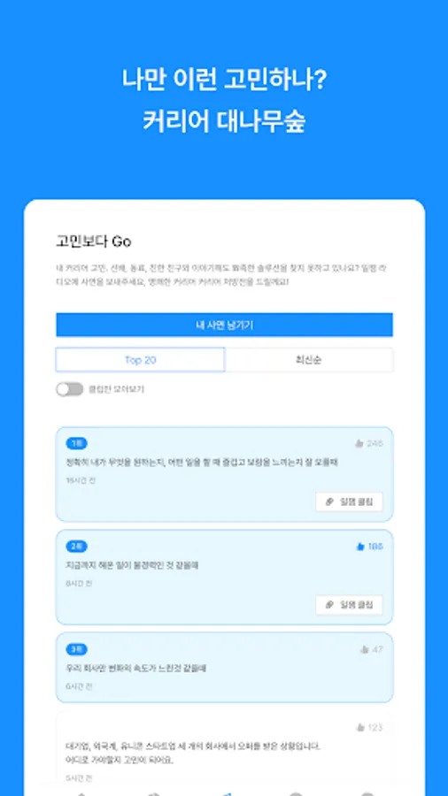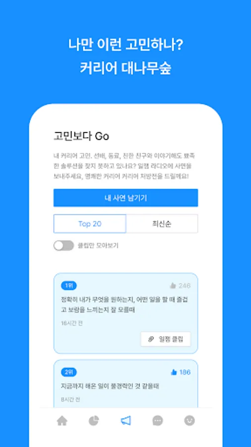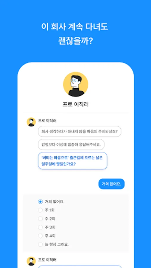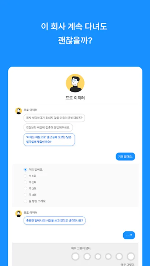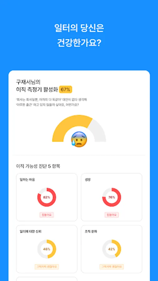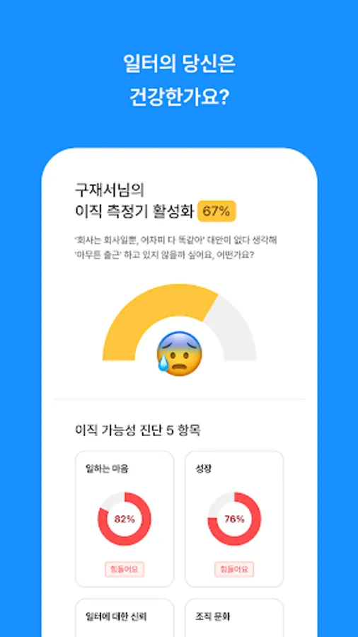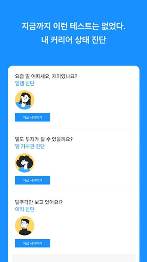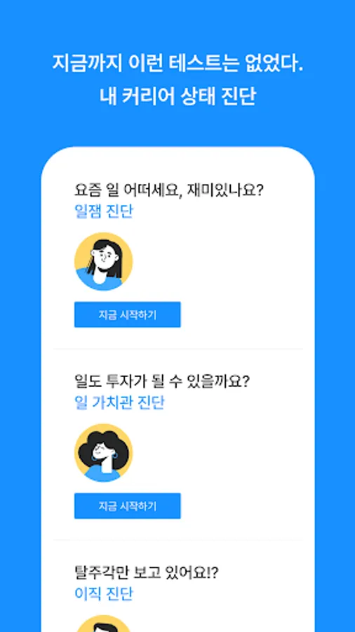 In the Career Wellness app, you can find various diagnoses to understand your career status, career advice tailored to your situation, and stories from people with similar concerns. We provide solutions for a healthy life at work, from workplace concerns, career direction, and workplace environment evaluation.