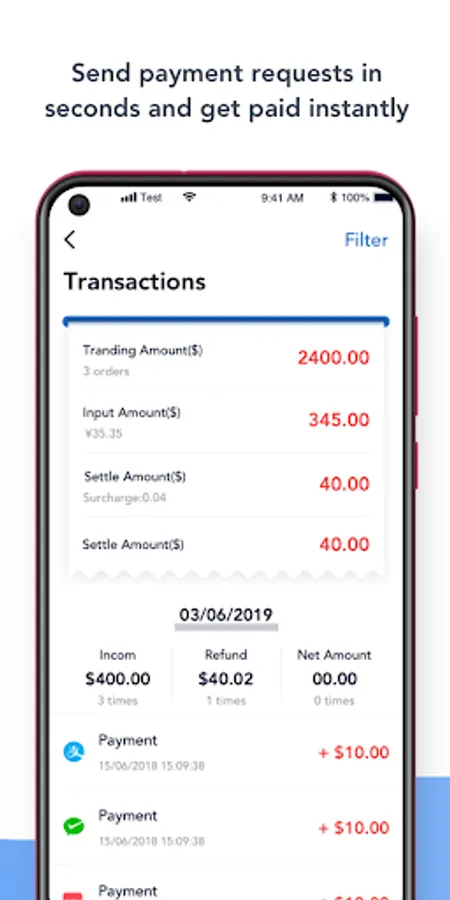 Access your account information, settlement reports and data analysis from your mobile. Receive confirmation of your transaction and settlements. Monitor your earnings wherever and whenever you want to.
