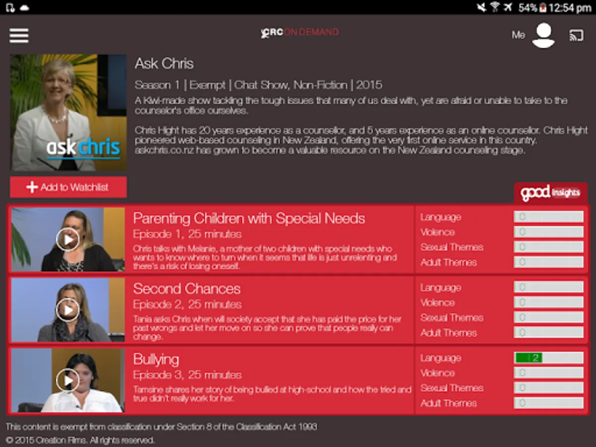 Utilise our powerful parental controls, which enables caregivers to determine the level of Language, Violence, Sexual and Adult themes you are comfortable with each of your children watching. These levels are displayed via our unique Insights panel for each movie and episode.