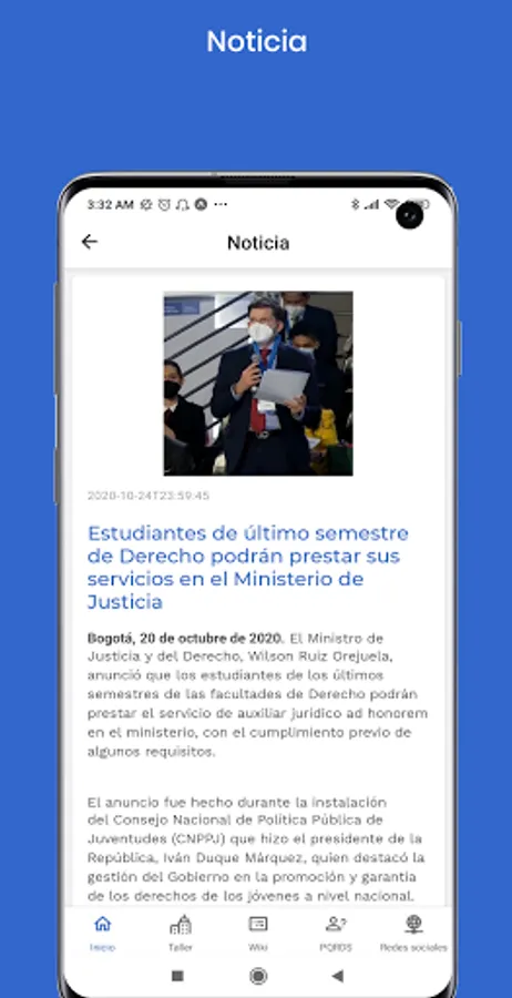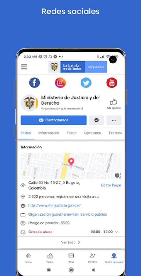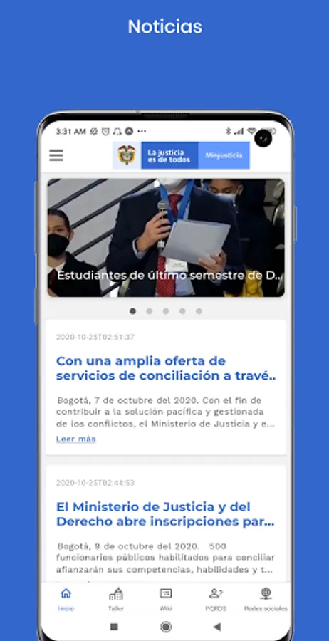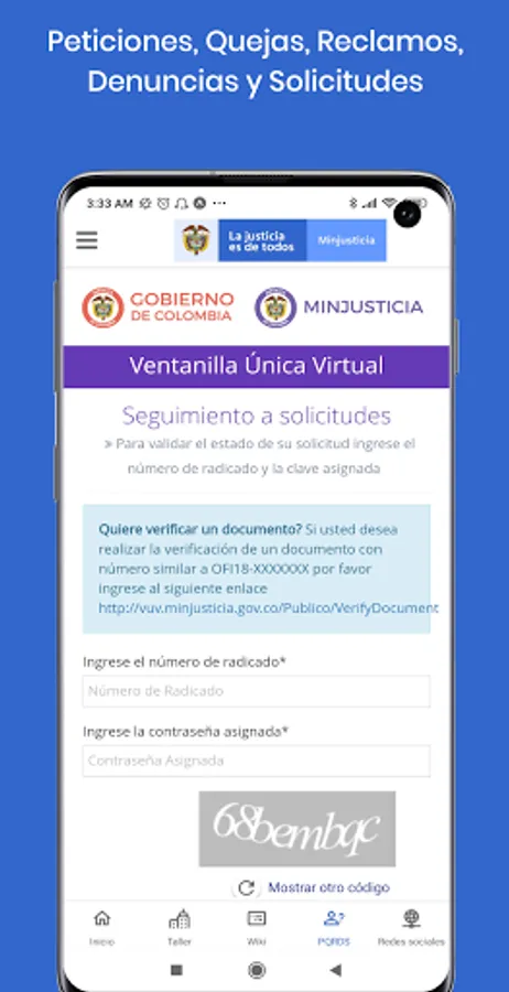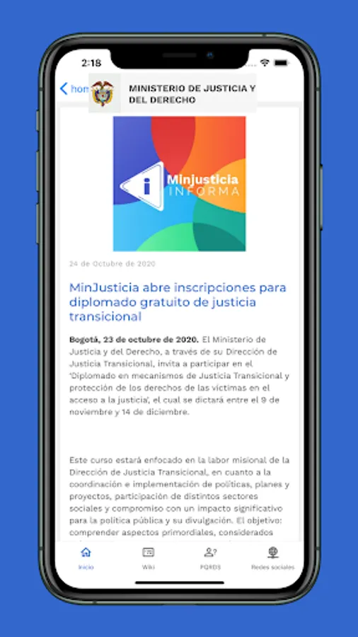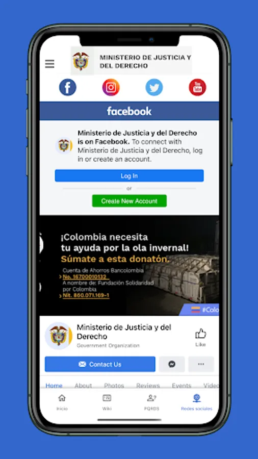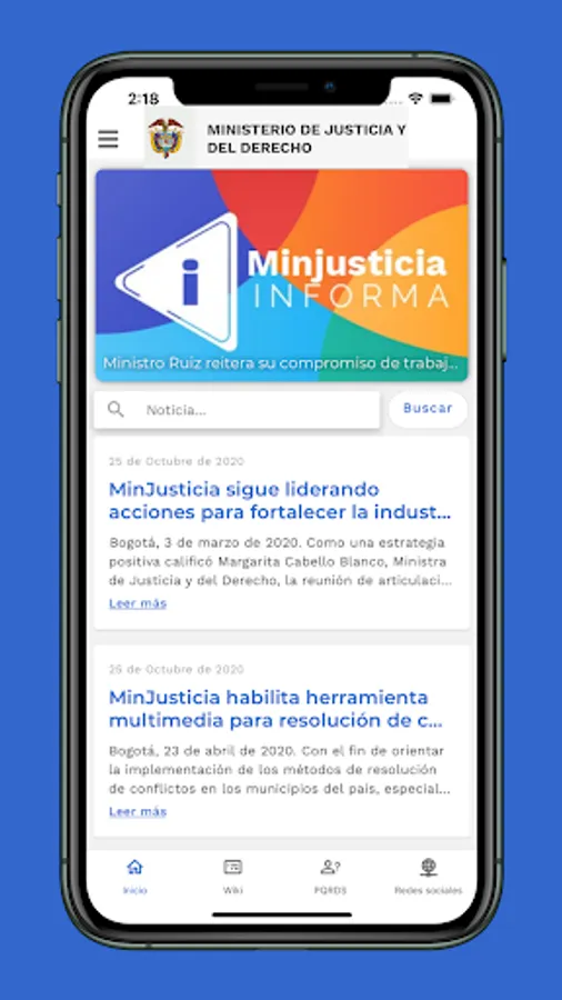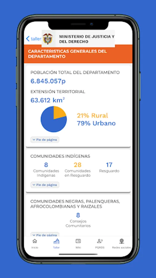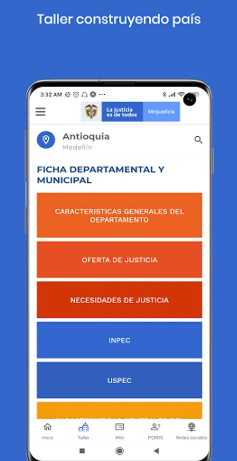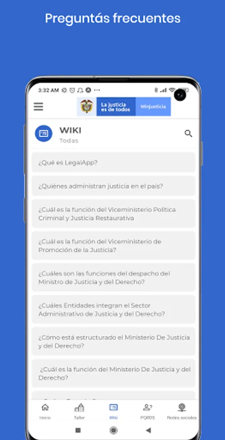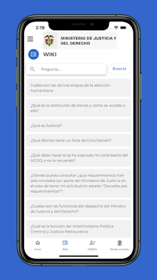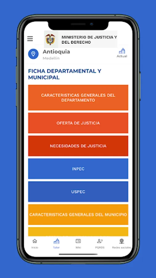 The mobile app of the Ministry of Justice and Law allows access and consultation of the modules of: PQRS, Social networks, information and knowledge in general and frequently asked questions of the entity, available to bring the citizen closer to the entity.