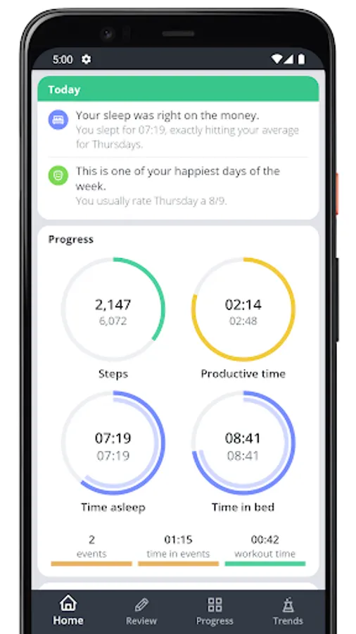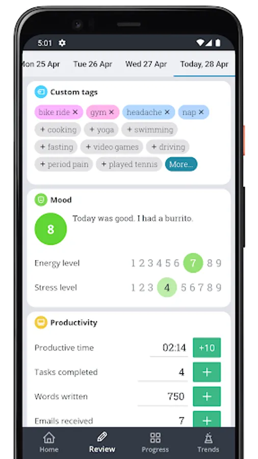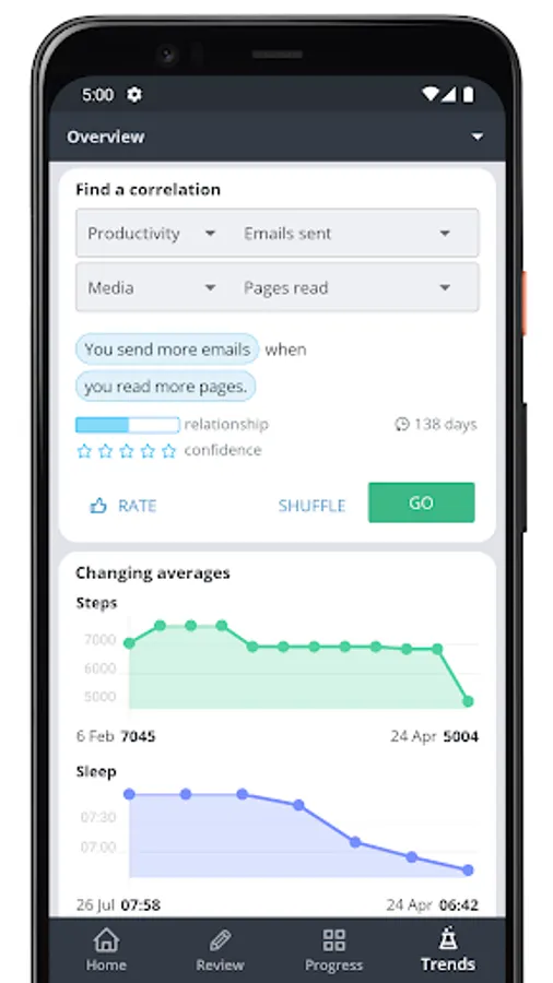 Use our Android app to track whatever you like using custom tags and manual tracking. Add tags to each day to represent things like events, people you were with, and pain and illness symptoms. Create your own numeric data points for things like quantities, durations, and even use a 1-9 scale for things like your energy and stress levels. Rate your mood nightly with optional reminders. We'll find relationships in your data to tell you what activities and habits go together, and what makes you happier. Use it to understand symptom triggers, what affects your sleep, and what factors contribute to a productive day.