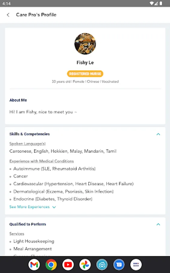 Before each visit, learn more about your Care Pro's skills and qualifications. Don't worry, we only hire those we'd trust to care for our own loved ones.
