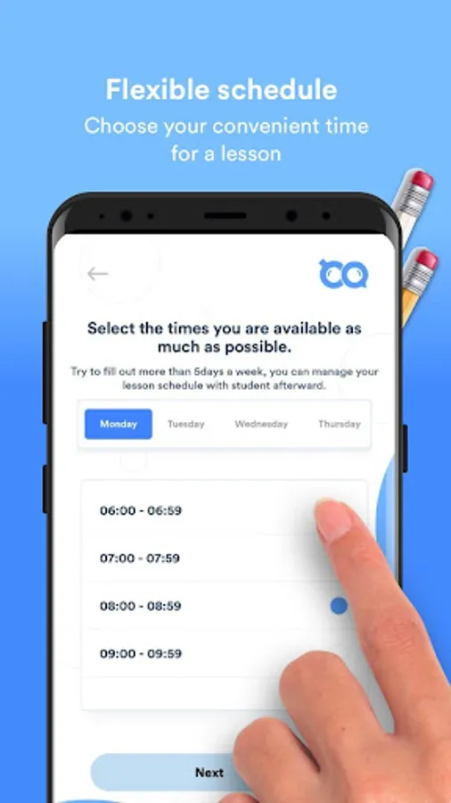 For lesson schedule, you can choose your favorite time, such as weekends, holidays, early morning or after office hour on weekdays.