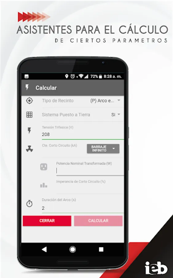 With this application it is possible to calculate arc flash based on the characteristics of the equipment to intervene. It has two modes of use, first as a loose test is used to perform a calculation quickly. The second way to associate and save all calculations so that they are associated with a project run by the company ieb.