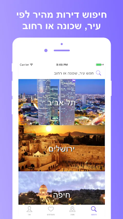 חיפוש דירות לפי עיר או כתובת, עם שלל אפשרויות סינון.