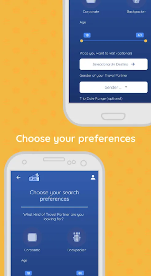 To travel with based on search options as Type of user, gender, travel dates range, and places in common.