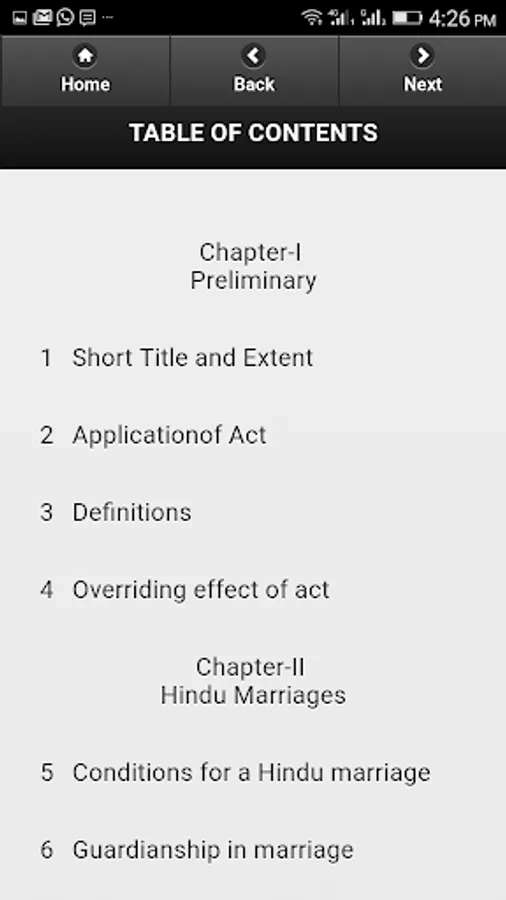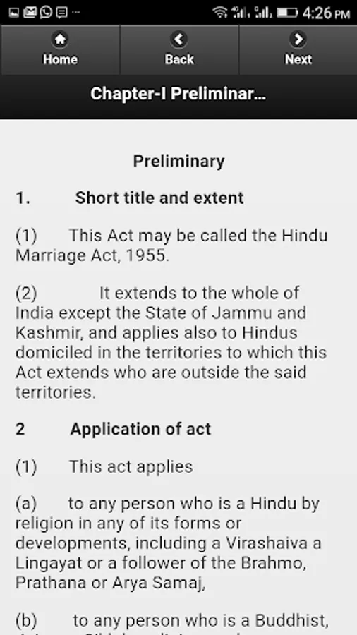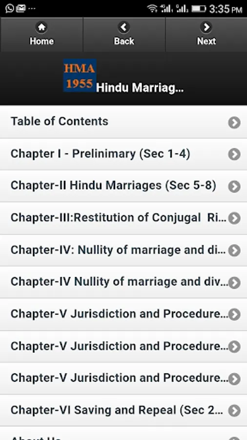 This app is a display of Hindu Marriage Act, 1955, as a bare act with an easy user interface facilitating to go to a particular chapter and then section. Section are displayed with comments