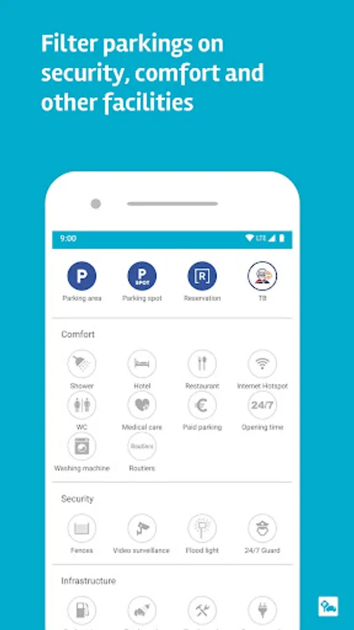 Use our filter to get what you need. Simplify your daily search for parking facilities; find parking for your truck on the fly.
