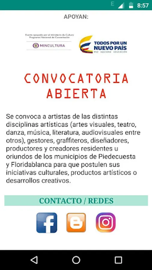 CONECTA2 as artistic scene encourages circulation and seeks to consolidate a space where the artwork is confronted with the public, so it is vital to the development of new artistic practices and to promote creative processes in the department meeting, a bet to building democratic and participatory scenarios. new scenarios that reactivates and encourage communities to come to the arts and artists to show work is conducive developed.