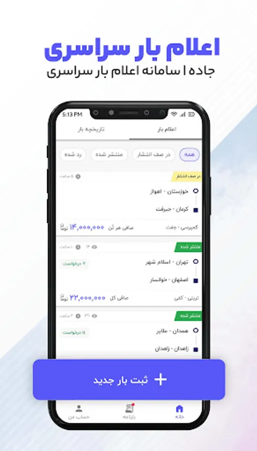 - در اپلیکیشن صاحب بار جاده ، میتوانید بار خود را تنها با چند کلیک ساده ثبت کنید و آن را بدون واسطه به مناسب ترین راننده کامیون اطراف بار با قیمت مناسب بسپارید