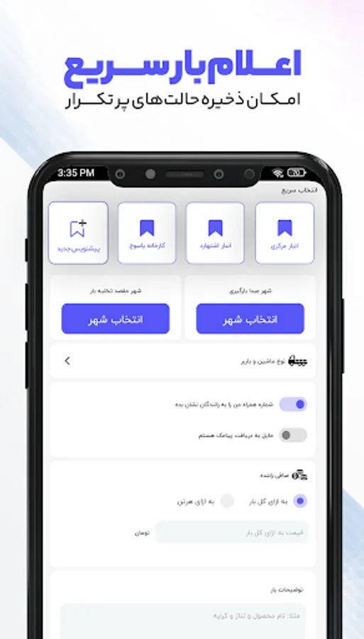 - برنامه و اپلیکیشن اعلام بار جاده به ساده ترین شکل طراحی شده و با کمترین اطلاعات و ساده ترین حالت ممکن ، اعلام بار شما به عنوان باربری با سرعت انجام میپذیرد