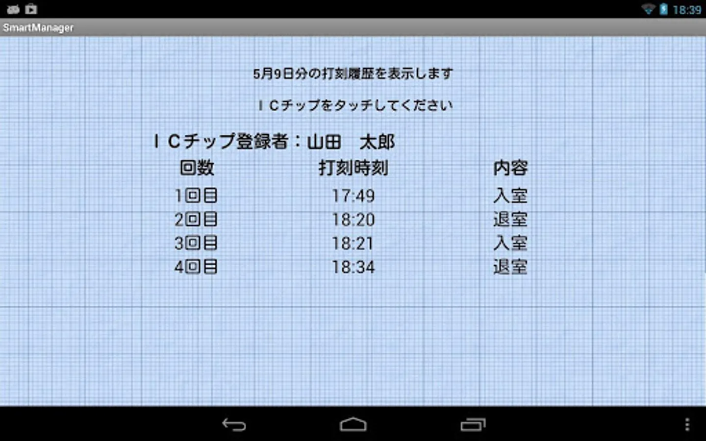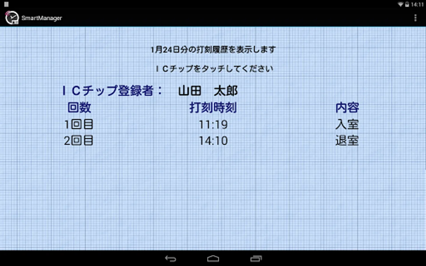 1. Users only need to touch an IC chip (employee ID card, Suica, etc.) to an Android terminal compliant with NFC, and attendance / leave / break is automatically registered.