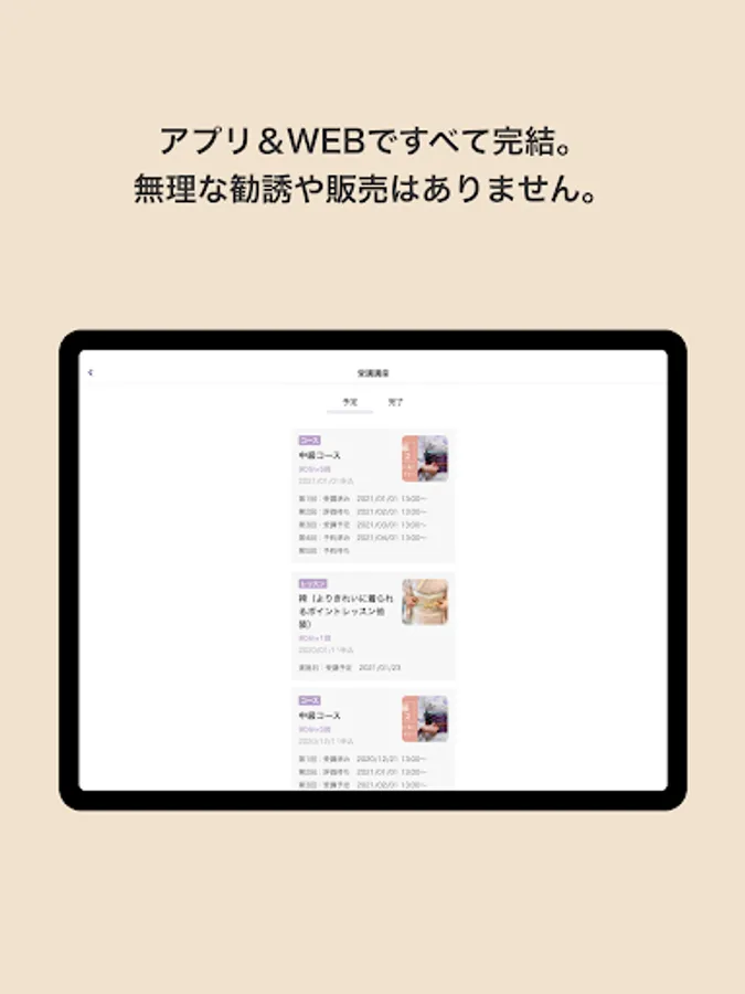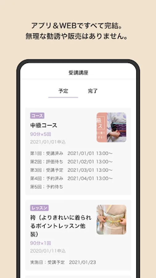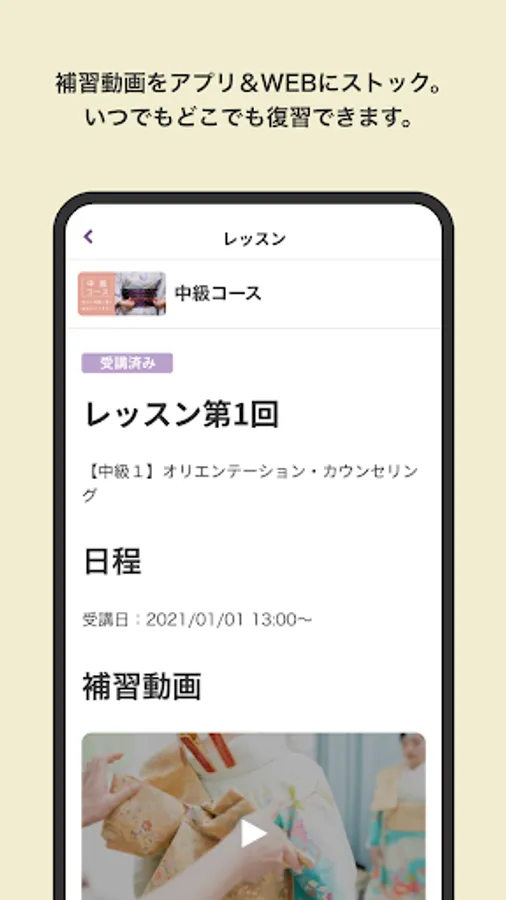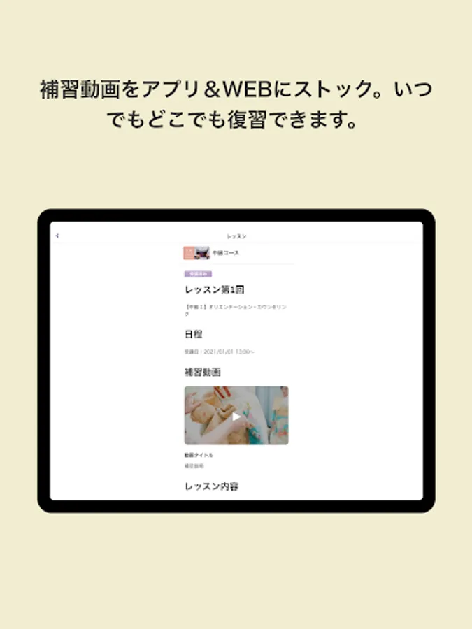 After taking the course, videos for supplementary lessons that match the content of the lesson will be stocked in the app. You can easily review the contents of the lesson while traveling by train or lying on the bed.