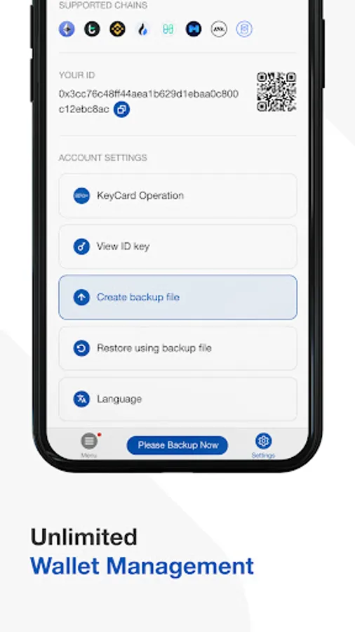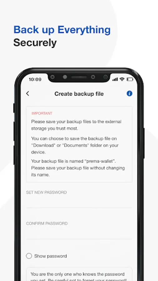 PREMA Wallet lets users create a secure backup file for all imported wallets at once. The file is highly encrypted with a custom password.