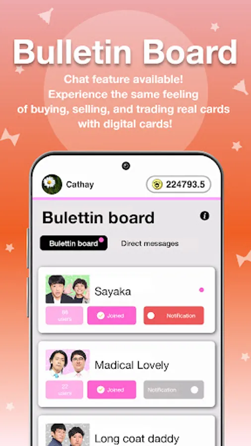The in-app Bulletin Board allows users to communicate with other users, share digital Koreka on SNS, interact with other fans, buy and sell via DM, and negotiate trades directly with each other. You can also browse albums among friends.