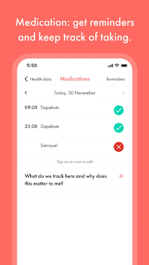 Track your daily situation: episodes, mood, energy, medication intake - quick and easily with one touch. You can additionally track anything you think is important for your condition