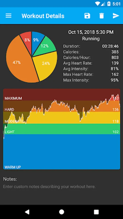 Scroll through your workout history to see the most important details of your workouts. Tap on any workout to see complete details for that workout including any notes that you've added.