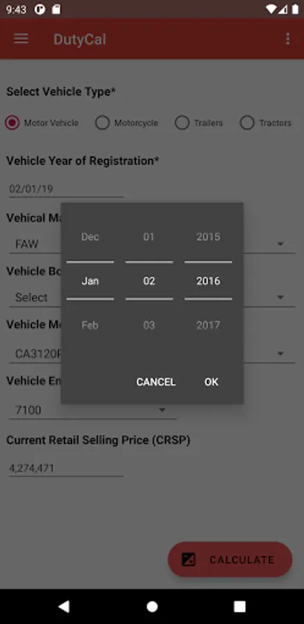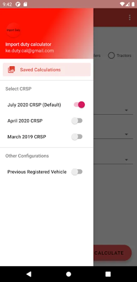 The app uses as default, latest motor vehicle CRSP list published on 30 June 2020. Though the user has an option to switch previous CRSP from the navigation menu on the to left of the app.