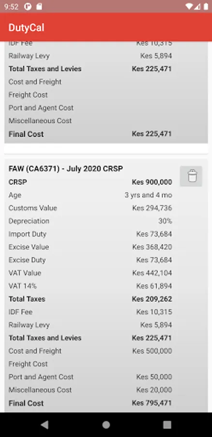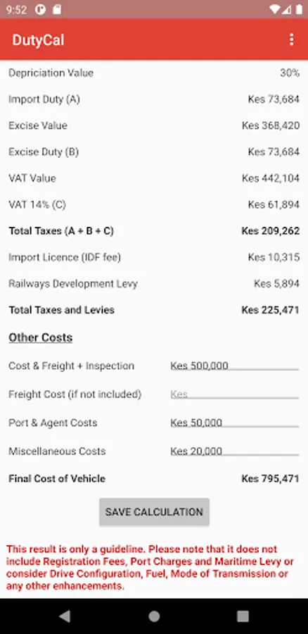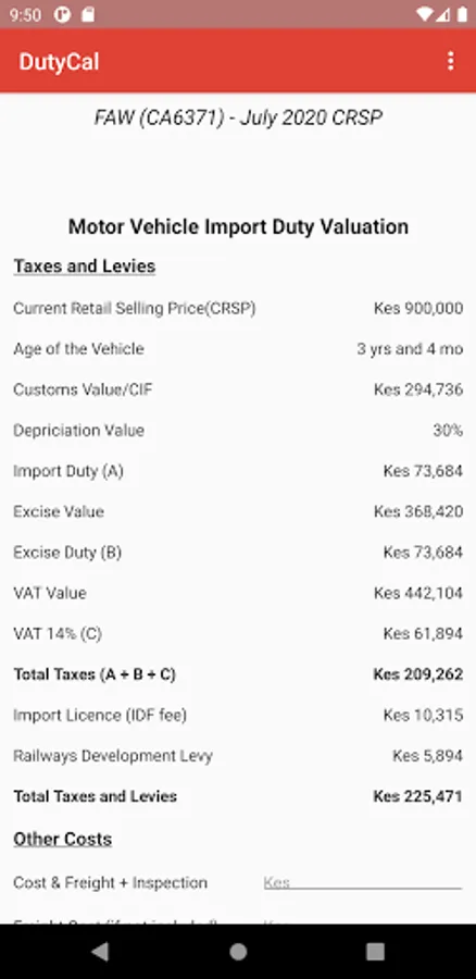 After selecting a car type, make and model, the app will calculate total tax and levies and it provides options to add additional cost like cost of freight, inspection, insurance, port and agent fees for calculation. It provides the following information.
