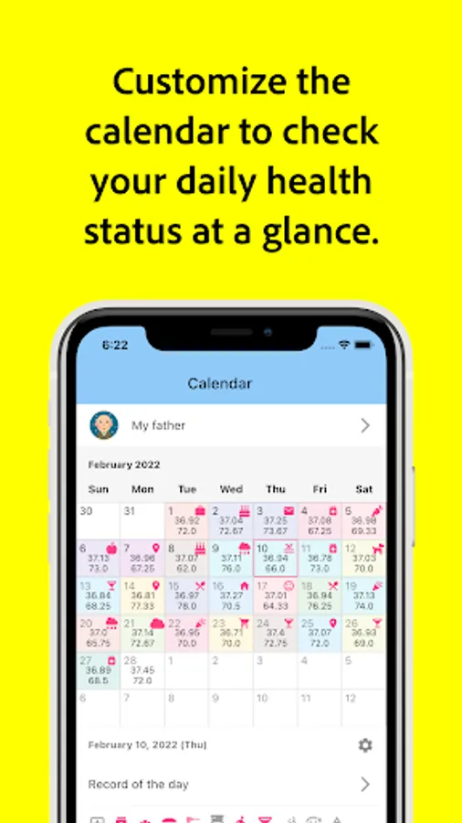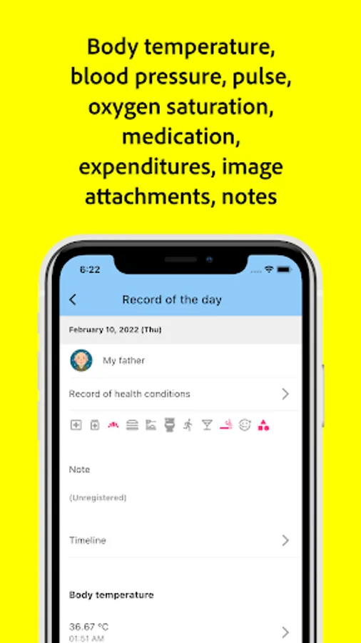 You can record the health status of family members such as body temperature, blood oxygen saturation, blood pressure, and pulse rate.