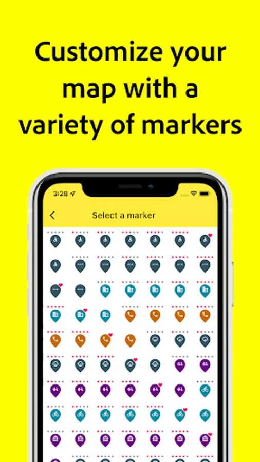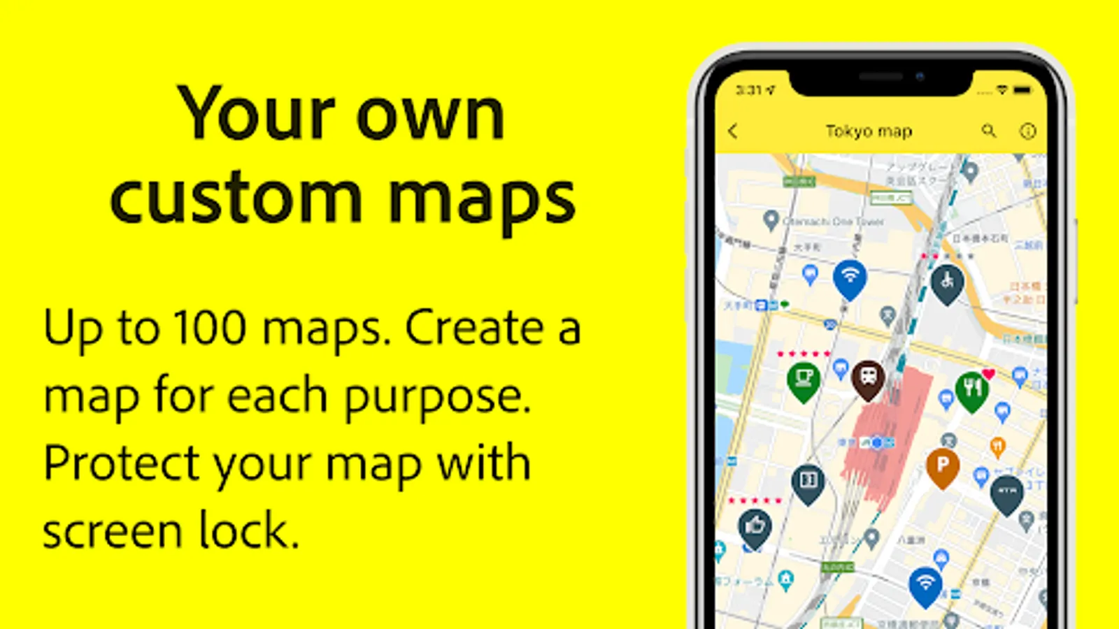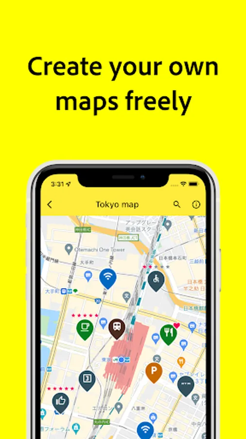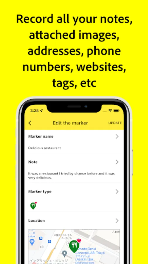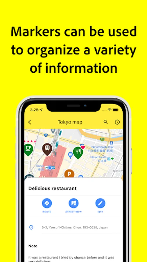 Each marker can register information such as notes, attached images, phone numbers, and websites.